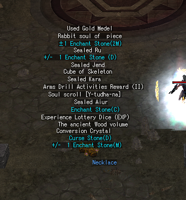 Rabbit soul;Rabbit soul of piece;Sealed Ru;Sealed Buwl;Sealed Aiur;Sealed Torr;Sealed Ray;Sealed Kara;Sealed Jade;Sealed Tumba;Sealed kai;Sealed Cruel;Sealed Jend;Sealed Slaughter;Enchant Stone(2M);Enchant Stone(2M);±1 Enchant Stone(2M);Compensation Hammer(2M);The ancient Soil volume;The ancient Fire volume;The ancient Water volume;The ancient Wood volume;The ancient Gold volume;The ancient Soil volume A;The ancient Fire volume A;The ancient Water volume A;The ancient Wood volume A;Experience Lottery Dice (EXP);Enchant Stone(1m);Curse Enchant Stone(1m);Holy Enchant Stone(1m);±1 Enchant Stone(1m);Preservation Stone(1m);Compensation Hammer(1m);Academy Graduation Gift Box;Enchant Stone(D);Holy Stone(D);Curse Stone(D);Enchant Stone(C);Holy Stone(C);Curse Stone(C);3% Enchant Stone(D);3% Holy Stone(D);3% Enchant Stone(C);3% Holy Stone(C);5% Enchant Stone(D);5% Holy Stone(D);5% Enchant Stone(C);5% Holy Stone(C);Enchant Stone(M);Cursed Stone(M);3% Enchant Stone(M);5% Enchant Stone(M);Holy Stone(M);3% Holy Stone(M);5% Holy Stone(M);+/- 1 Enchant Stone (D);+/- 1 Enchant Stone (C);Ru;Buwl;Torr;Aiur;Ray;Jade;Kara;Tumba;Arms Drill Activities Reward(I);Arms Drill Activities Reward(II);Arms Drill Activities Reward(III);kama1;kama2;Cube of Warrior;Cube of Skeleton;Cube of Ancient;Cube of the Gong;Cube of the Hyun;Cube of the Jin;Cube of Legend;Crystal of Fury;Crystal of Hatred;Crystal of Discord;Crystal of Greed;Soul scroll [Y-tudha-na];Soul scroll [DarkKnight];Adolph;Baron;Kooper;Pavian