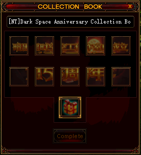 Collect all 10 types of event materials listed above and place them into the [NT] Dark Space Anniversary Collection Book (placement interval is 2 seconds).