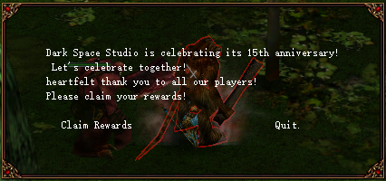 2. Enter "DARK-DARK-DARK-DARK" at the Lottery Redemption Center to receive one Glorious Years Gift Pack for the 15th Anniversary of Dark Time Studio. Limited to one claim per account.