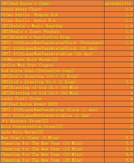 7. Right-clicking on [NT] Red Horse's Chest will randomly generate one of the following items: